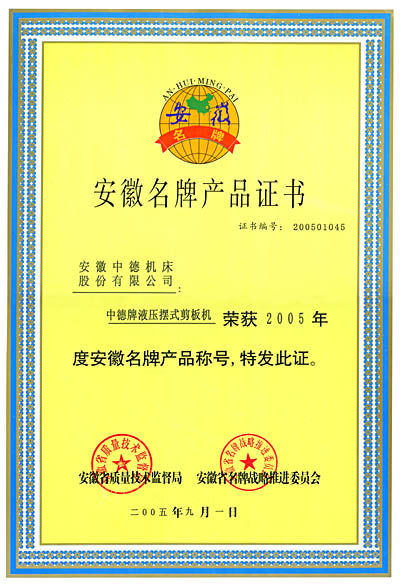 “中德牌”剪板機榮獲2005年“安徽名牌產品”稱號