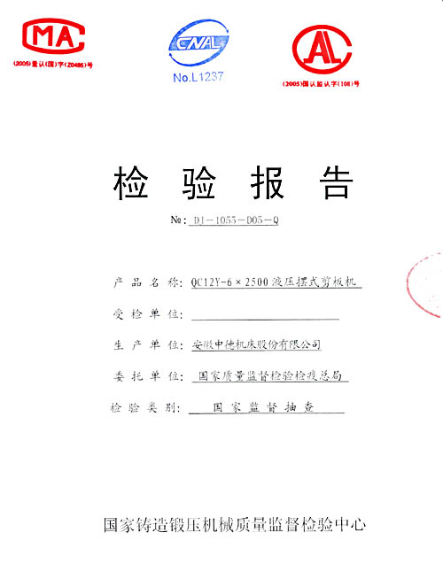 根據2006年第4季度剪板機國家監督抽查實施方案,受國家質量監督檢驗檢疫總局委托,國家鑄造鍛壓機械質量監督檢驗中心,于2006年9月23日,對本公司產中德牌液壓擺式剪板機進行了現場檢驗。近日,我公司收到了本次抽檢的結果通知單及檢驗報告,結果為:合格