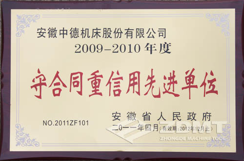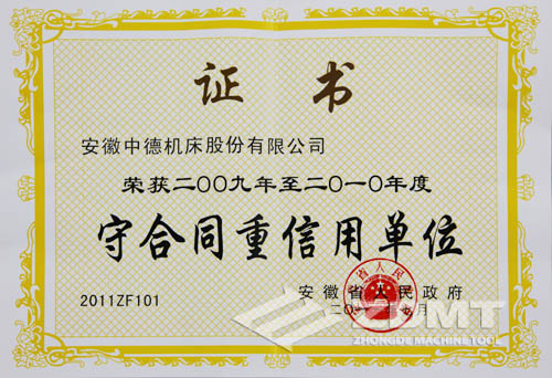 這也是我公司第三次獲得省政府授予的“守合同重信用先進單位”稱號,公司不斷發(fā)揚“守合同、重信用”的良好傳統(tǒng),不斷探索、潛心經(jīng)營,逐漸建立、健全了一套適合市場規(guī)律和行業(yè)、企業(yè)自身特點的合同管理機制,強化了合同的管理,確保了合同的履行,呈現(xiàn)出合格率100%,優(yōu)良率85%以上,履約率達100%的喜人景象,取得經(jīng)濟效益和社會效益的雙豐收,贏得了社會各界的廣泛認可,增強了社會大眾對“中德機床”品牌的認知度,加速了品牌傳播、提升了品牌知名度,樹立了中德機床公司良好的社會形象。